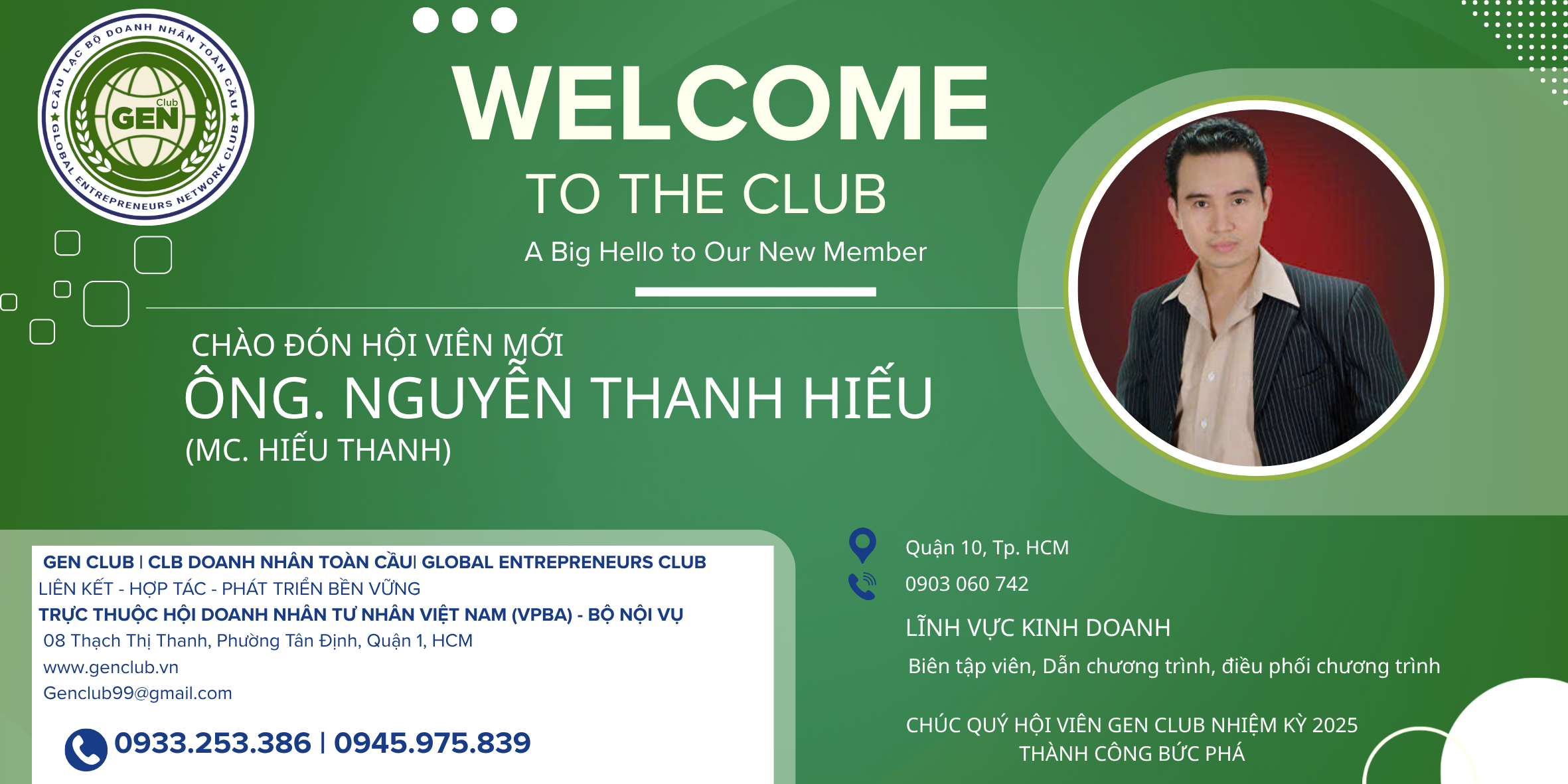 Đặc biệt, ở cương vị một Ủy viên BCH, anh cam kết sẽ dành trọn tâm huyết, cùng Ban Sự kiện xây dựng nên những chương trình có chiều sâu, sáng tạo, phản ánh đúng tầm vóc và khát vọng của cộng đồng doanh nhân trong GEN Club. Sự đồng hành của MC Hiếu Thanh không chỉ dừng lại ở vai trò chuyên môn, mà còn là sự gắn bó bằng cả trái tim và trách nhiệm.